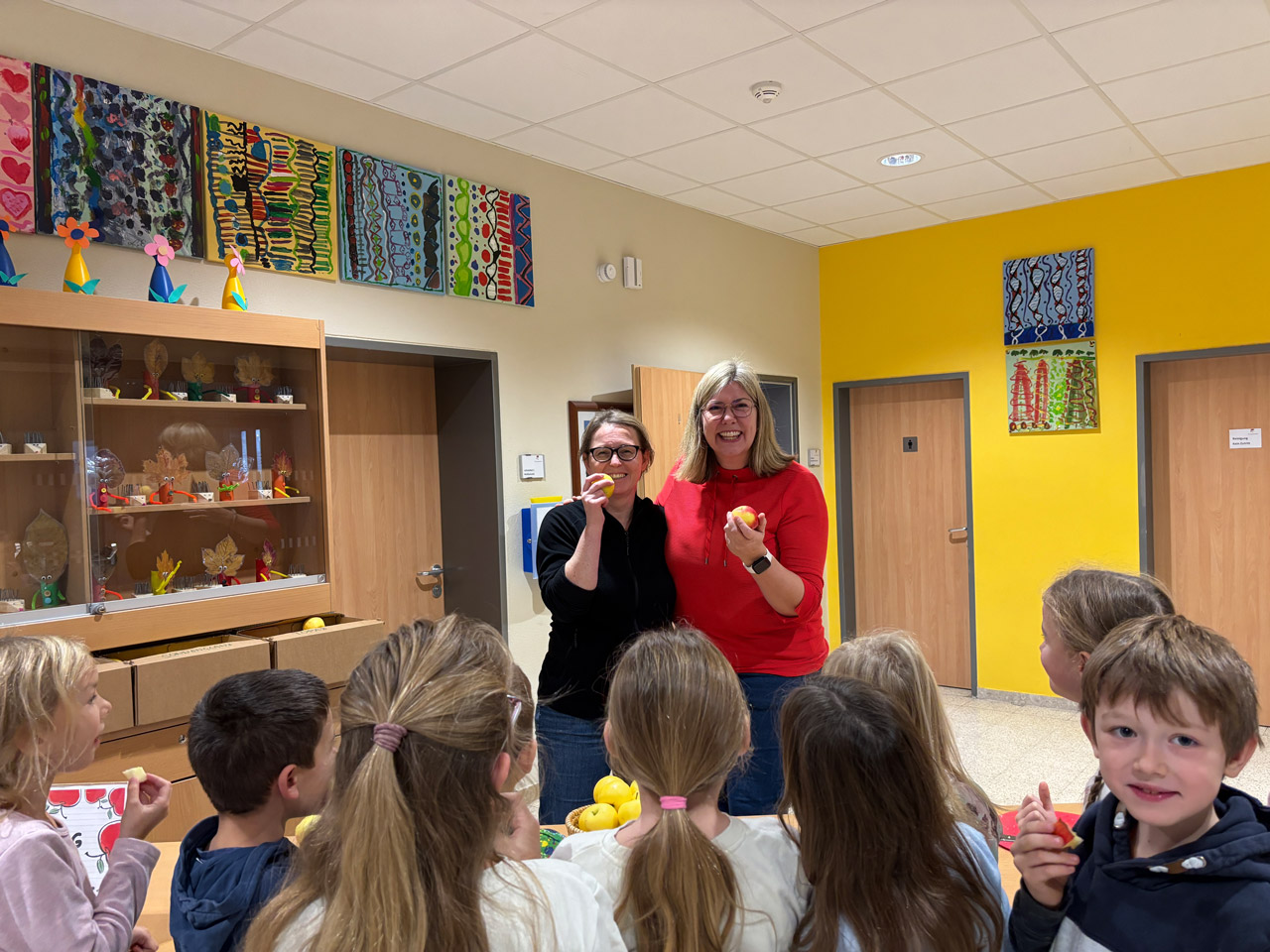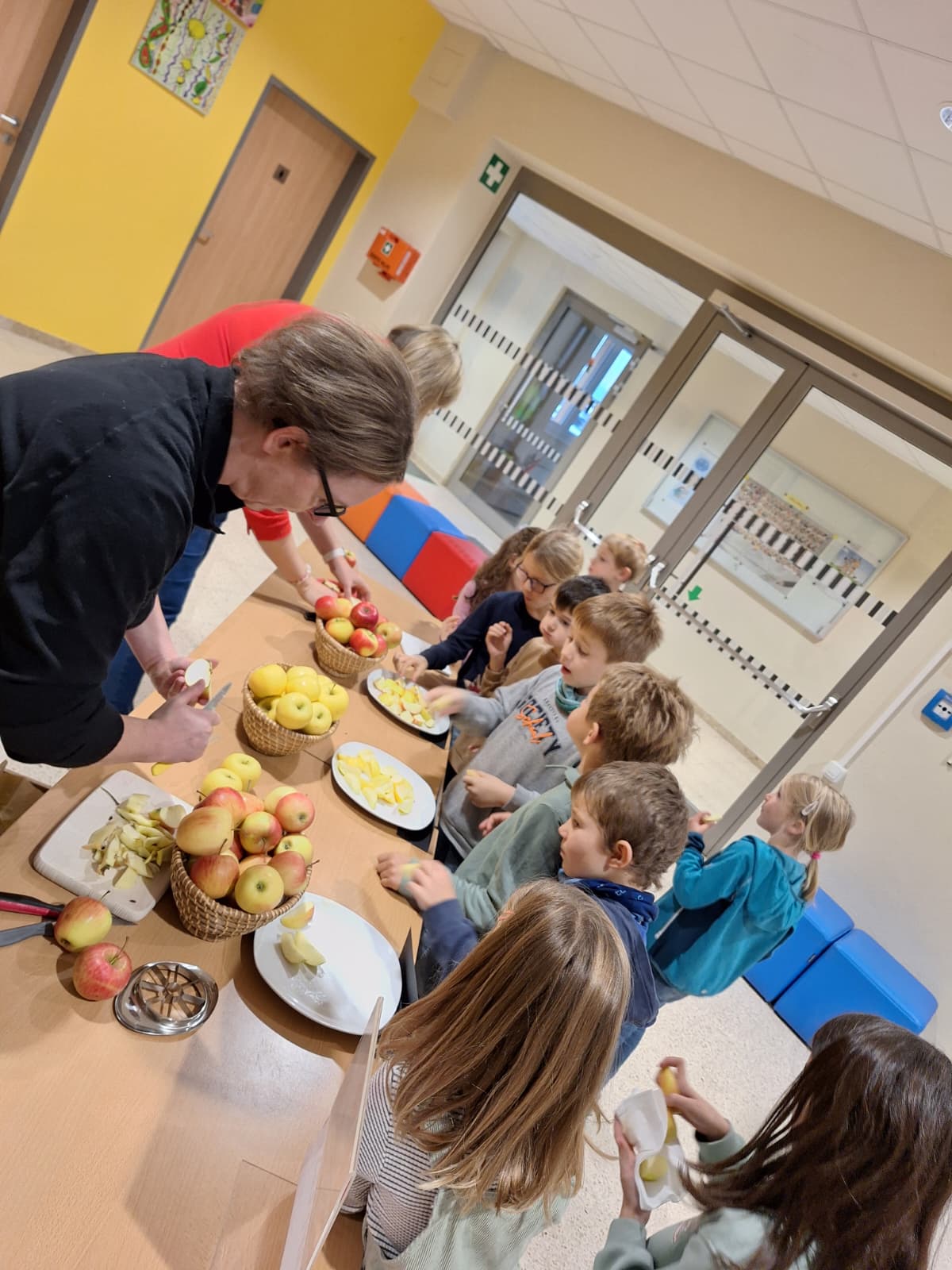 Besonders beliebt war die Auswahl: Es standen drei verschiedene Apfelsorten zur Verfügung – Topaz, Sonnenglanz und Pinova. So konnte jedes Kind seine Lieblingssorte entdecken.